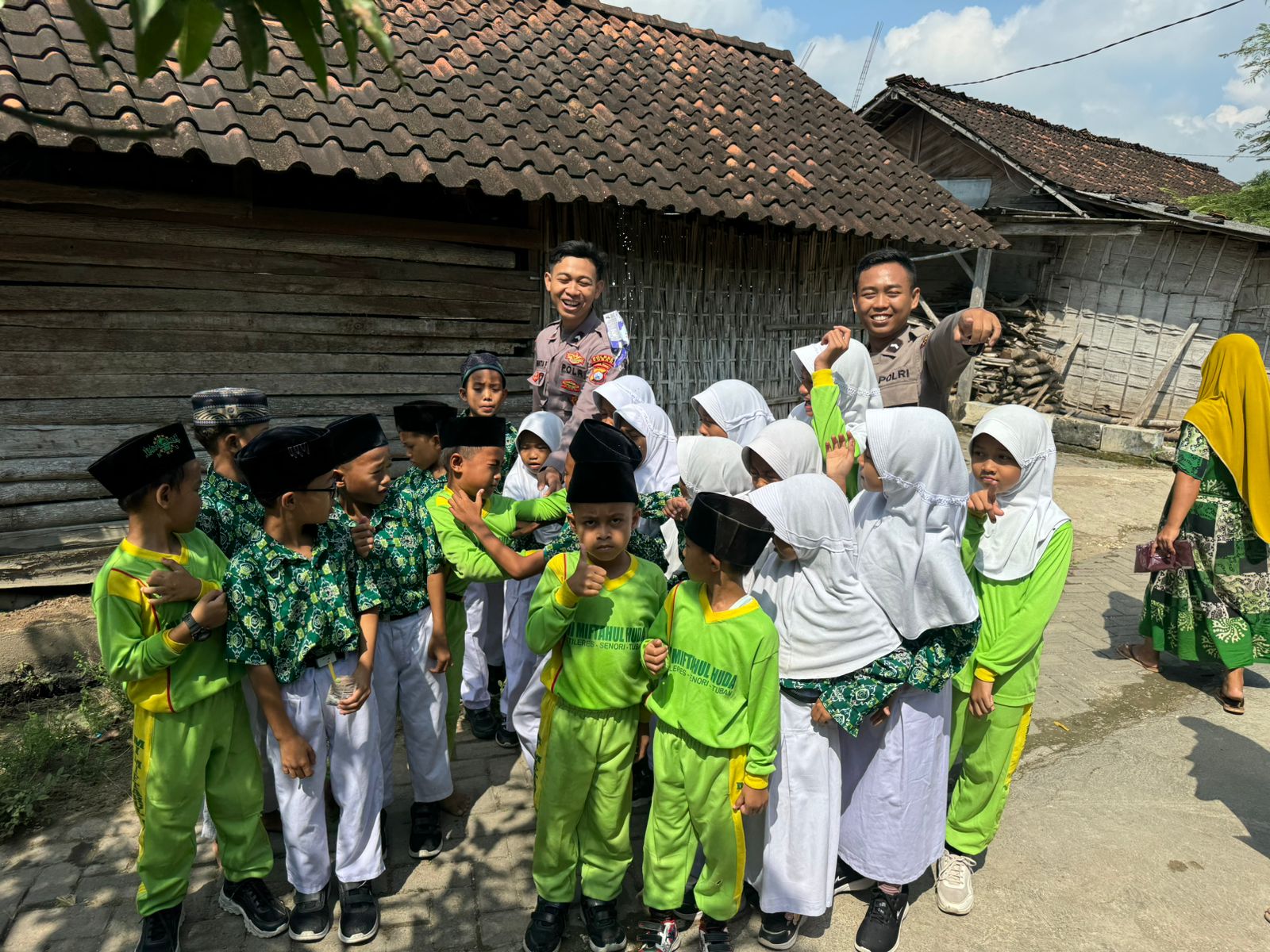Dimana pada kesempatan tersebut anggota Bhabinkamtimas menyapa dan bercengkrama dengan para pelajar MI yang sedang menikmati jam istirahat di lingkungan sekolah.