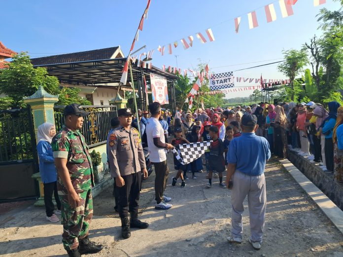 Senori – Bhabinkamtibmas Desa Wanglu Kulon Polsek Senori Polres Tuban Polda Jatim, Bripda M. Khoirul Anam bersama anggota Babinsa Kopda Suntari serta dibantu Linmas Desa Wanglu Kulon, melaksanakan pengamanan kegiatan jalan sehat dalam rangka peringatan HUT Kemerdekaan RI ke-80 yang diselenggarakan oleh Panitia PHBN Desa Wanglu Kulon Kec, Senori, Sabtu (6/9/2025) pagi.