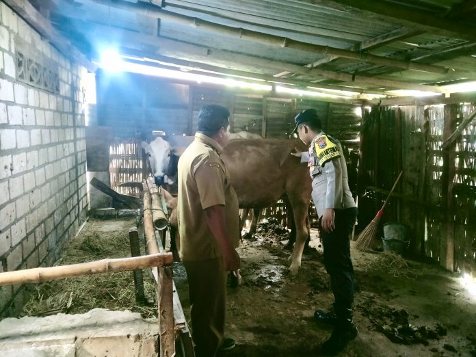 Senori – Dalam rangka mencegah penyebaran Penyakit Mulut dan Kuku (PMK) pada hewan ternak. Anggota Bhabinkamtimas Polsek Senori Polres Tuban Polda Jatim Bripda Rifki Syahroni Al Maftoriq bersama Kepala Desa (Kades) Wanglu Kulon Darmono memberikan binluh kepada warga pemilik ternak sapi di Dusun Gayu Desa Wanglu Kulon Kecamatan Senori, Selasa (4/2/2025) pagi.