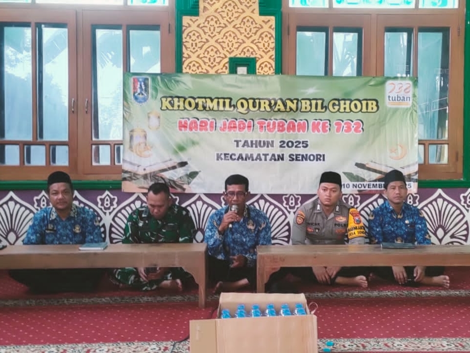 Senori – Pemerintah Kecamatan Senori Kabupaten Tuban menyelenggarakan kegiatan Khotmil Qur’an Bil Ghoib dalam rangka peringatan hari jadi Kabupaten Tuban ke 732. Kegiatan dilaksanakan di masjid Al Alawi Desa Sendang, Selasa (11/11/2025).