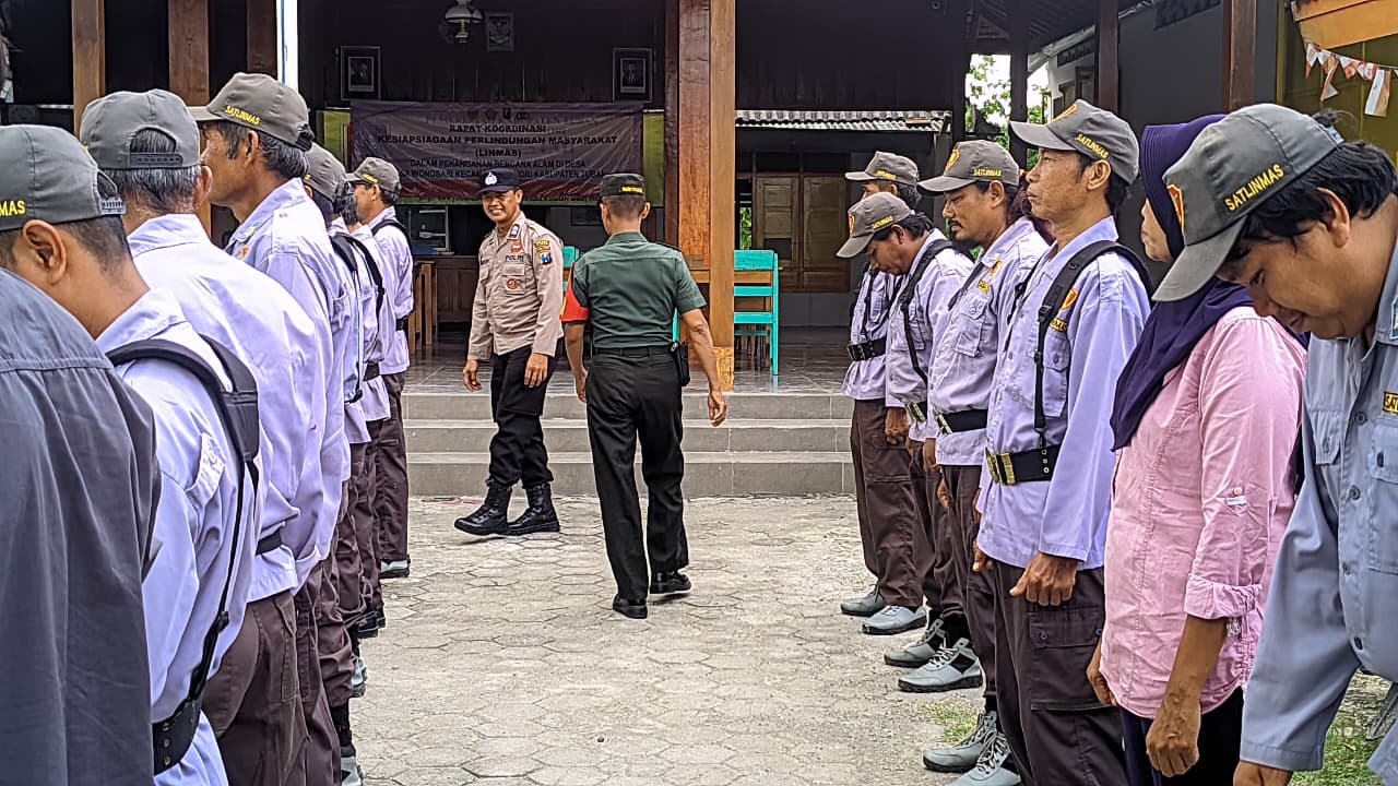Senori – Aiptu Ahmadi anggota Polsek Senori Polres Tuban Polda Jatim yang bertugas sebagai Polmas Desa Wonosari Kec, Senori bersama Kepala Desa (Kades) Wonosari FX Widiarto dan Babinsa Serka Subiyanto, memberikan pembinaan kepada petugas Linmas Desa Wonosari.