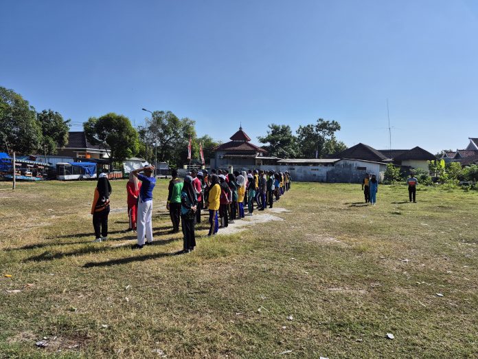 Ps Kanit Samapta Polsek Senori Polres Tuban Polda Jatim Aiptu Ahmadi bersama anggota Koramil Senori dan anggota Satpol PP Kecamatan Senori secara langsung melatih para pelajar dari tingkat sekolah lanjutan tingkat atas yang telah lolos seleksi, Minggu (3/8/2025).