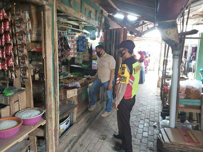 Kenduruan – Cegah gangguan kamtibmas dan tindak kriminalitas dilokasi pasar, anggota Polsek Kenduruan Polres Tuban melaksanakan patroli blusukan Pasar tradisional Desa Sidomukti, sekaligus dialogis dan himbauan kamtibmas dengan pedagang dan pengunjung pasar. Sabtu (20/3/2021) pagi.