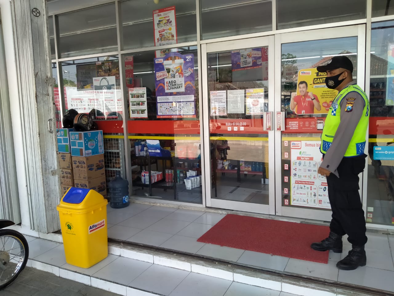 Jaga kamtibmas kepolisian sektor Parengan Resor Tuban melaksanakan kegiatan patroli ke Alfamart antisipasi kerawanan kejahatan curat, curas dan curanmor di lingkungan pertokoan Alfamart desa Parangbatu kecamatan Parengan kabupaten Tuban, sabtu, 1/5/2021