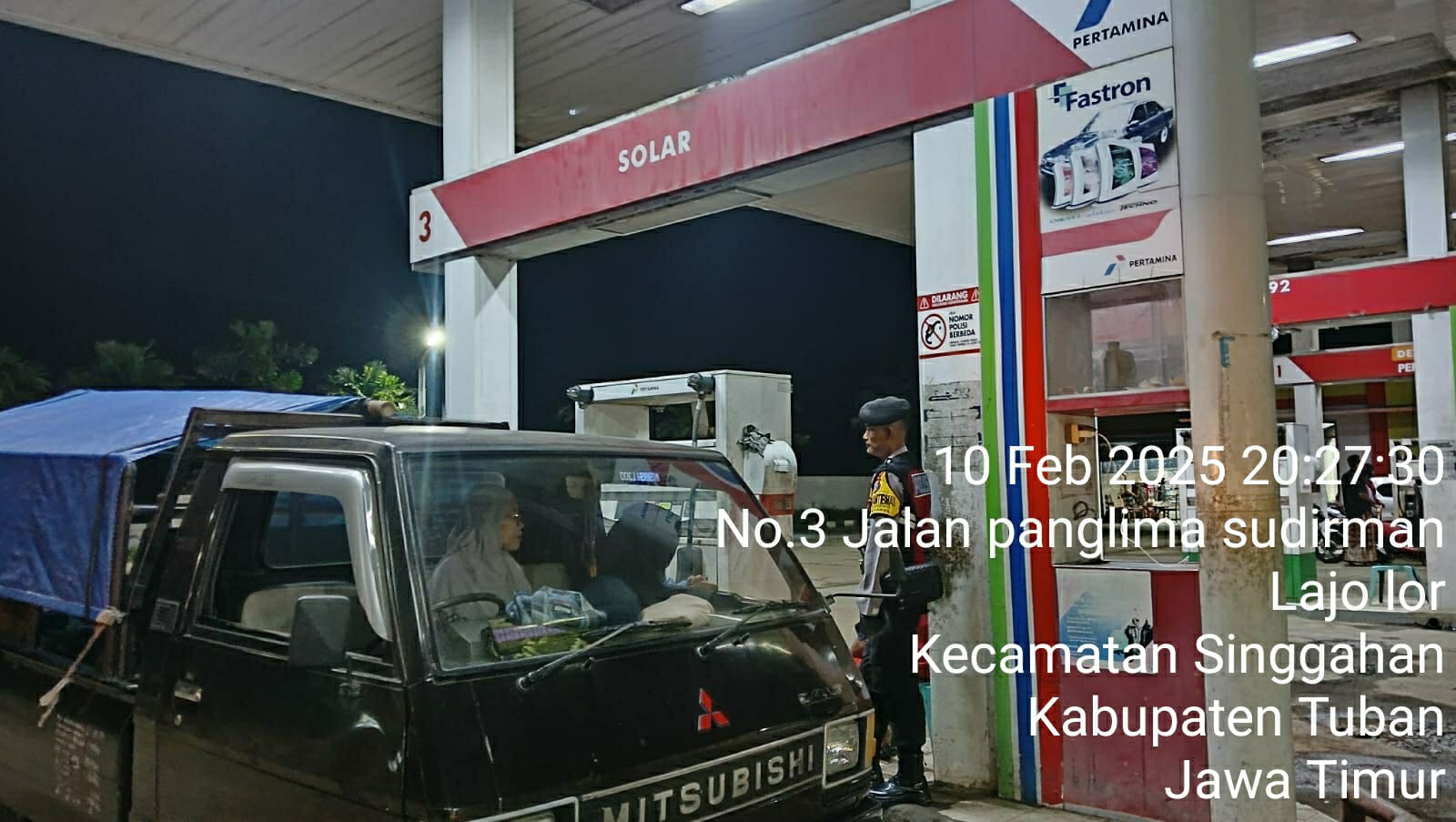 Guna mengecek kuota BBM agar tidak terjadi kelangkaan, Personil Polsek Singgahan Polres Tuban Polres Tuban melaksanakan patroli dengan sasaran SPBU desa Lajolor Kecamatan Singgahan Kabupaten Tuban. Senin (10/02/2025).