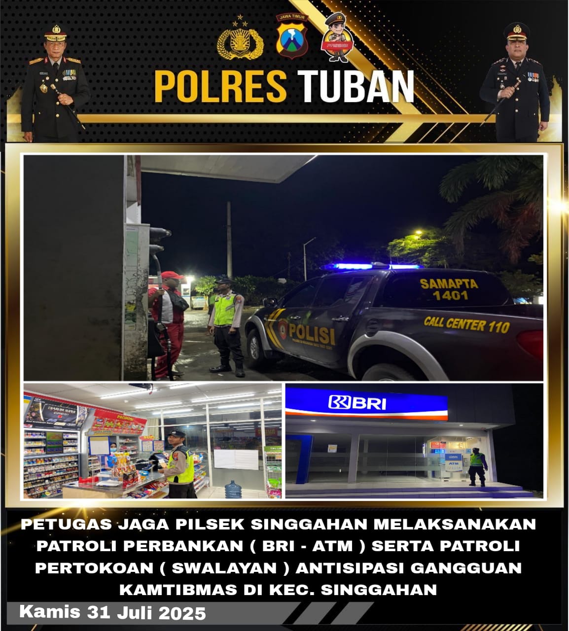 Salin itu petugas juga menyampaikan pesan kamtibmas kepada karyawan SPBU Podang Desa Lajolor yang sedang beraktifitas agar waspada dan berhati hati terhadap pelaku kejahatan jangan sampai memanfaatkan situasi SPBU yang ramai, serta nyalakan CCTV untuk mempermudah membantu pengawasan sehingga tercipta situasi aman serta kondusif,” tuturnya.