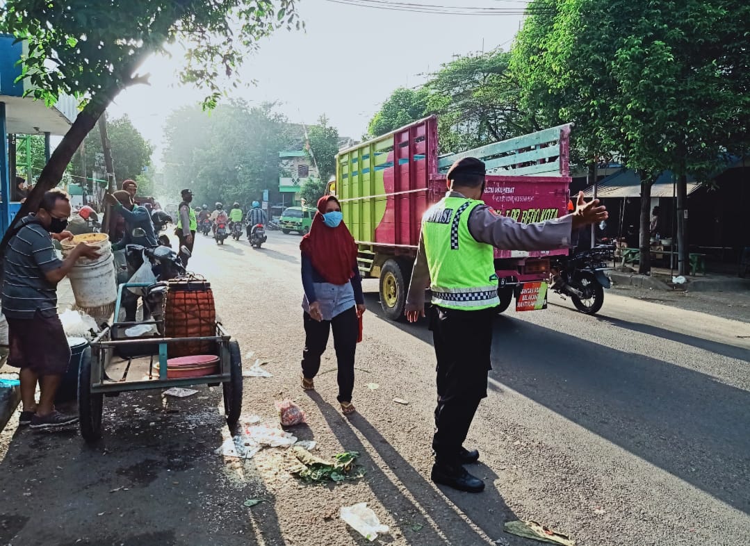 Petugas  mengatur lalu lintas agar lalu lintas tetap lancar. Hal ini dilakukan mengingat banyaknya pengguna jalan yang melintas di tempat tersebut, ditambah lagi masyarakat juga banyak yang lalu lalang di pasar untuk mencari kebutuhan sehari-hari.