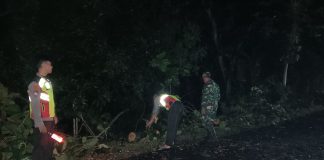 Anggota Polsek Senori Polres Tuban Polda Jatim Evakuasi Pohon Tumbang Di Jalan Desa Jatisari