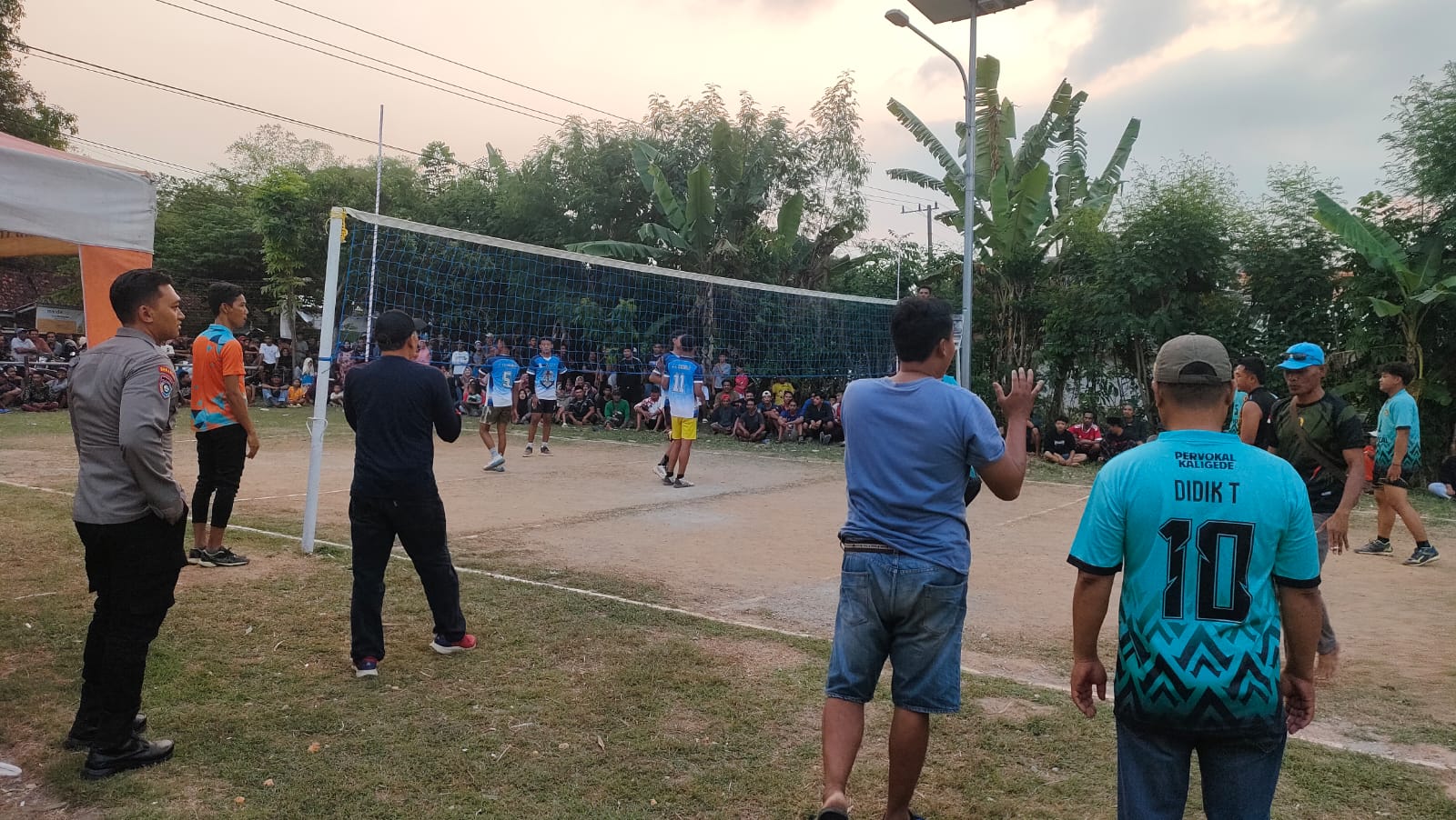 Senori – Dua personil Polsek Senori Polres Tuban, Aiptu Ahmadi dan Bripka Eko Wahyu melaksanakan pengamanan turnamen Bola voli dalam rangka HUT Kemerdekaan RI ke 80 yang diselenggarakan oleh Panitia PHBN Kec, Senori di lapangan Desa Wanglu Kulon Kecamatan Senori, Minggu (14/9/2025).