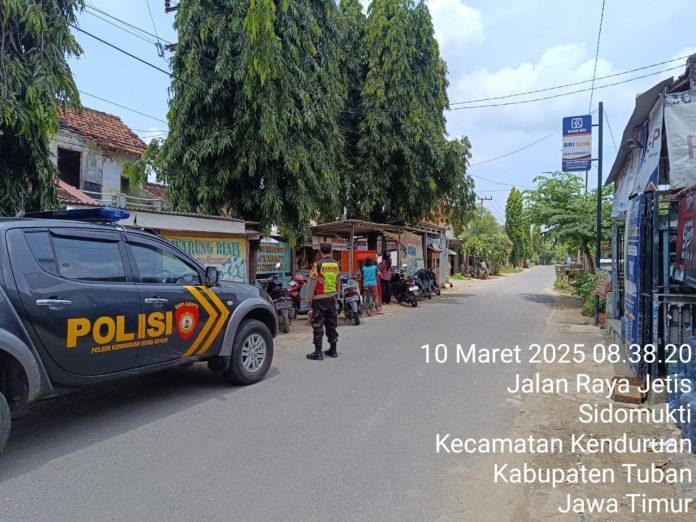 TUBAN, Kenduruan,- Guna antisipasi gangguan kamtibmas maupun tindak kejahatan lainnya, anggota Polsek Kenduruan Polres Tuban, melaksanakan patroli seputaran pasar Desa Sidomukti, Senin (10/03/2025)