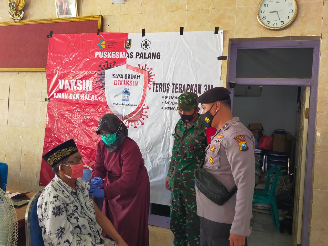 seopini.com – PolresTubanJatim Polres Tuban, Aipda Edi Hariyanto anggota Polsek Palang Polres Tuban selaku Bhabinkamtibmas Desa Pliwetan bersama Babinsa Desa Pliwetan Melaksanakan pengamanan dan pengawasan kegiatan Vaksinasi Covid 19 warga masyarakat Desa Pliwetan yang  berusia manula yang dilaksanakan di Balai Desa Pliwetan Kecamatan Palang Kabupaten Tuban, pada hari Senin ( 03/05/2021).