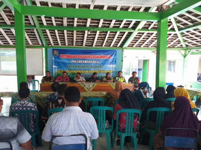 Kenduruan – Tumbuhkan sinergitas dan jalin kemintraan dengan pemerintahan Desa dan berbagai elemen masyarakat, Bhabinkamtibmas Desa Jlodro Polsek Kenduruan Polres Tuban Bripka Yulistiyono menghadiri giat Musrenbangdes di Desa Binaanya. Sabtu (1/2/2020) siang.