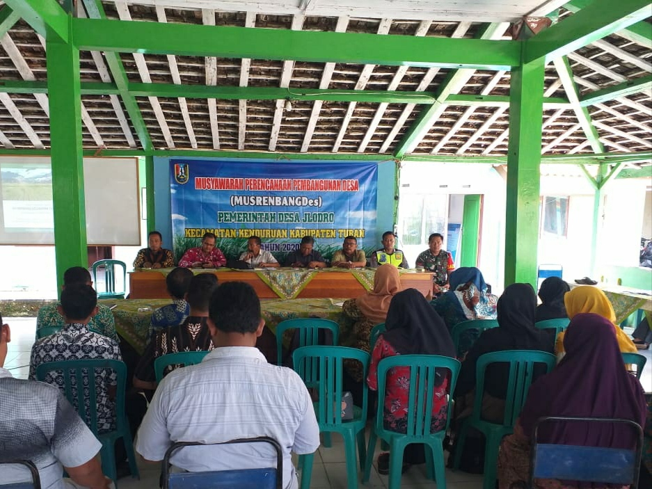 Ikut hadir dalam kegiatan Musyawarah Perencanaan Pembangunan Desa (Musrenbangdes) antara lain tim dari Kecamatan Kenduruan di pimpin bapak Sekcam Kenduruan, Babinsa dan Bhabinkamtibmas Desa Jlodro, Kepala Desa Jlodro dan perangkat Desanya, Ketua RT dan Ketua RW, BPD, Karang Taruna,Tokoh Masyarakat dan Tokoh pemuda.