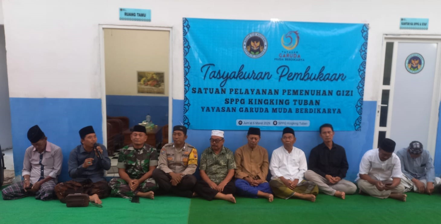 Tuban – Bhabinkamtibmas Kelurahan Kingking, anggota dari Polsek Tuban jajaran Polres Tuban, menghadiri kegiatan tasyakuran pembukaan Satuan Pelayanan Pemenuhan Gizi (SPPG) Kingking Tuban yang diselenggarakan oleh Yayasan Garuda Muda Berdikarya, Jumat (6/3/2026).