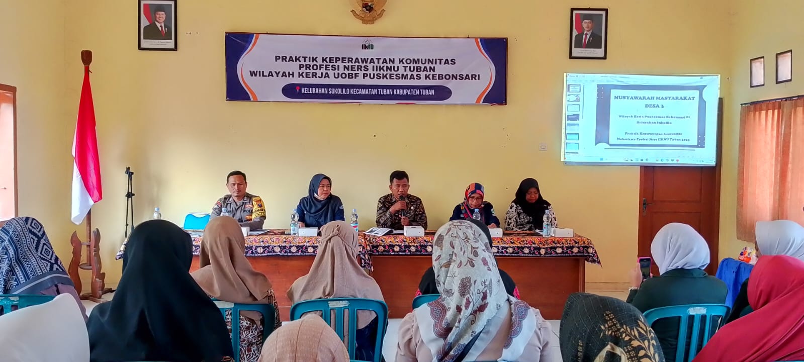 Tuban — Bhabinkamtibmas Kelurahan Sukolilo, Polsek Tuban, menghadiri kegiatan Musyawarah Masyarakat Desa (MMD) yang diselenggarakan oleh mahasiswa Ners Institut Ilmu Kesehatan Nahdlatul Ulama (IIKNU) Tuban, bekerja sama dengan Petugas Puskesmas Kebonsari dan kader kesehatan wilayah Sukolilo, Rabu (23/7/2025).