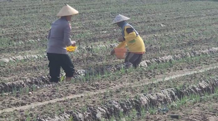 Dalam upaya mendukung program pemerintah Ketahanan Pangan Nasional Anggota Polsek Bancar Polres Tuban Jatim membantu petani dalam proses Tanam Bawang Merah.