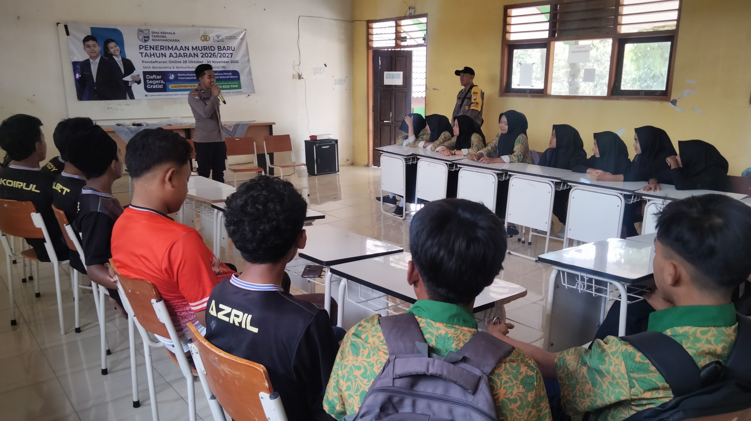 Polsek Montong Polres Tuban – Bhabinkamtibmas Polsek Montong Polres Tuban Bripda Moch Dio melaksanakan kegiatan sosialisasi penerimaan murid baru SMA Kemala Taruna Bhayangkara Tahun Ajaran 2026/2027 di SMPN 3 Montong, Rabu (5/11/2025).
