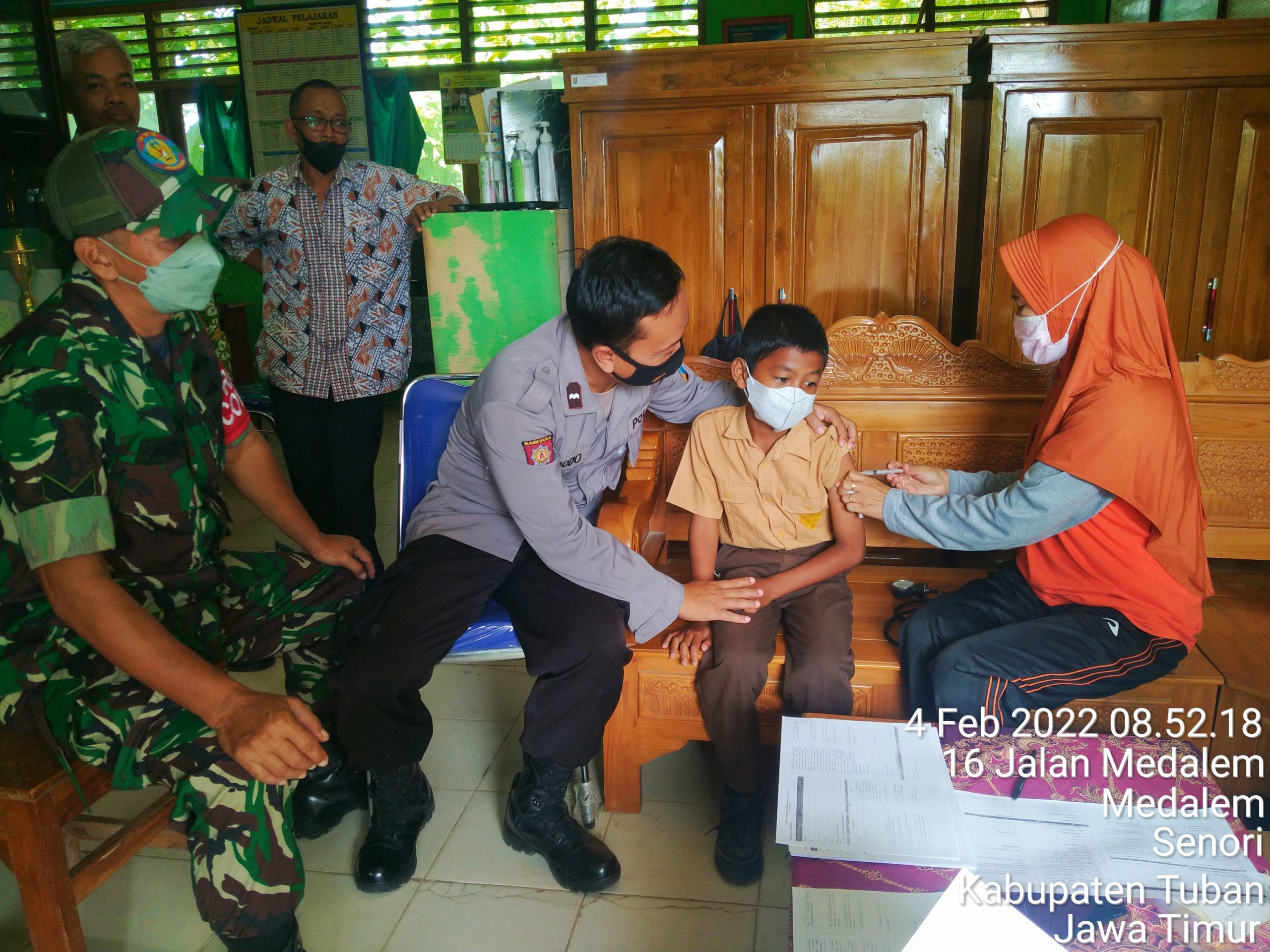 Senori – Personel Bhabinkamtibmas Polsek Senori Polres Tuban bersama Babinsa Koramil Senori melaksanakan pendampingan pelaksanaan vaksinasi Covid-19 tahap ke 2 di sejumlah SD dan MI yang ada di wilayah Kecamatan Senori, Jum’at (4/2/2022).