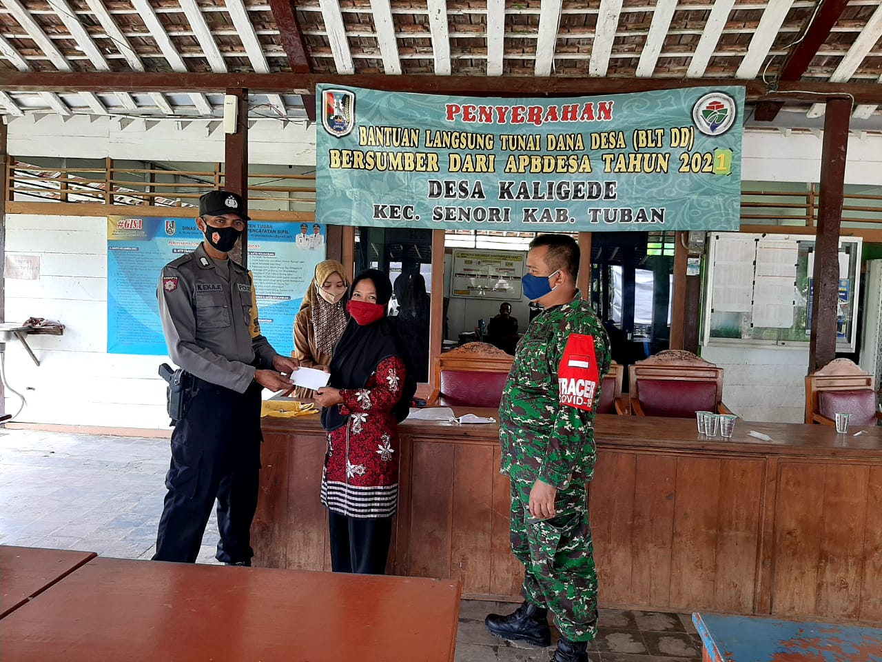 seopini.com-polrestubanpoldajatim Bhabinkamtibmas Desa Kaligede Polsek Senori, Polres Tuban Polda Jatim, Bripka Nanang Eka bersama Babinsa Sertu Lis Rokim hadir di Balai Desa Kaligede Kec, Senori, guna melakukan pendampingan sekaligus pengamanan penyaluran Bantuan Langsung Tunai Dana Desa ( BLT-DD ), Senin (5/4/2021).