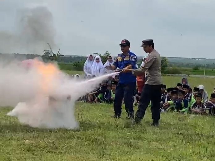 Pada kesempatan tersebut anggota Bhabinkamtimas juga turut serta mempraktikkan memadamkan api dengan Alat Pemadam Api Ringan (APAR) di hadapan peserta sosialisasi yang didominasi oleh pelajar.