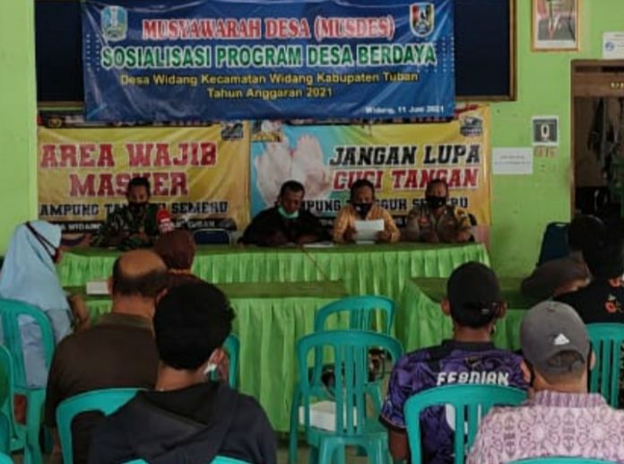 Bripka Karjono Bhabinkamtimas Polsek Widang menghadiri acara Musyawarah Desa (Muses) di Balai Desa Widang, Jumat (11/06/2021).