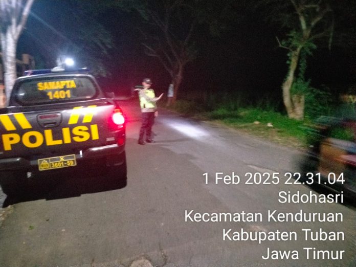 TUBAN, Kenduruan,- Guna mencegah terjadinya tindak kejahatan yang terjadi pada malam hari, anggota Polsek Kenduruan Polres Tuban Gelar Blue Light Patrol tengah malam hingga dini hari, Sabtu (01/02/2025) malam.