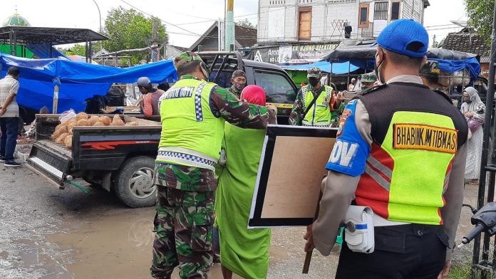 Kegiatan sosialisasi dilanjutkan dengan blusukan ke dalam pasar untuk mendisiplinkan warga agar mentaati protokol kesehatan dengan cara memberikan teguran secara humanis kepada pengunjung pasar yang diketahui tidak menggunakan masker.