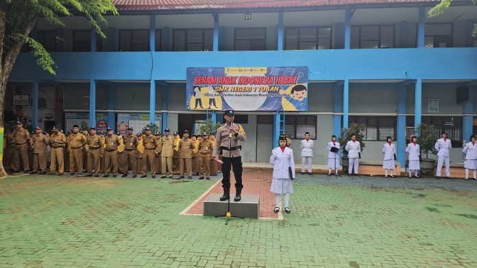 Tuban — Anggota Kepolisian Sektor (Polsek) Tuban, Bripka Didik Hariatmaja, bertindak sebagai pembina upacara bendera di SMK Negeri 1 Tuban pada Senin (10/2/2025).