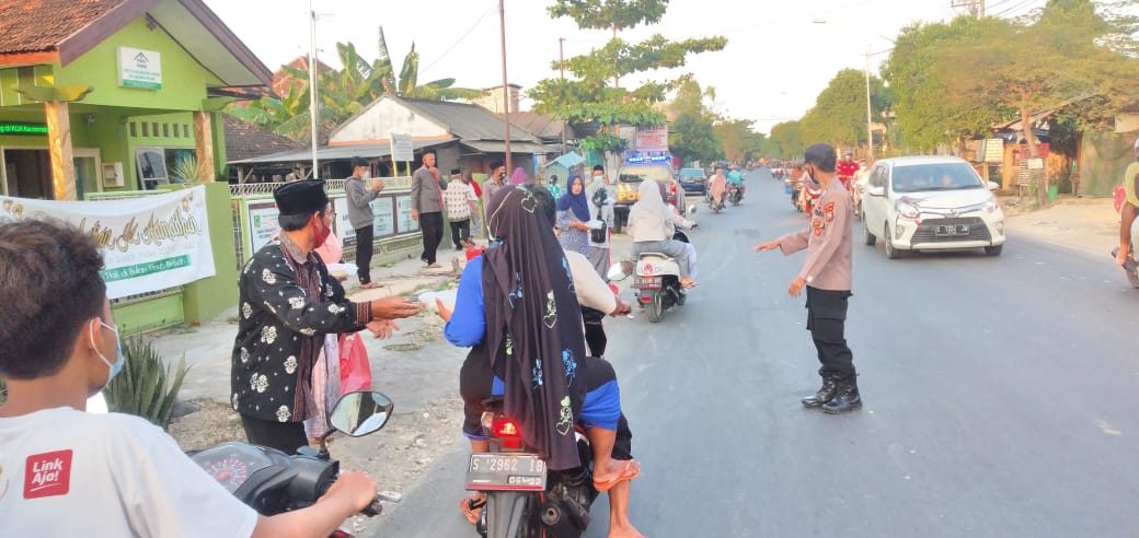 Palang serta Anggota TNI Koramil Palang, melakukan pembagian Takjil kepada pengguna jalan raya di Jalan Raya Tuban -Gresik di depan Kantor KUA Palang,pada hari Sabtu (01/05/2021).