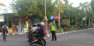 POLANTAS TUBAN BERDIRI TEGAK DI PAGI HARI MENGATUR KERAMAIAN DI JALAN RAYA