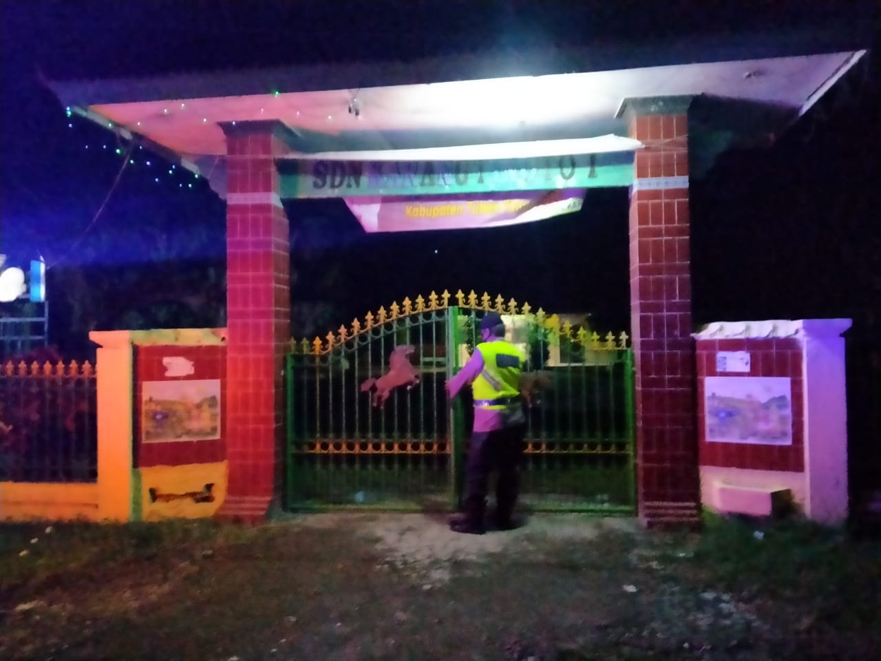Pada kegiatan patroli kali ini, petugas menyambangi sejumlah gedung sekolah yang ada di desa-desa , salah satunya di SDN Karangtinoto Kecamatan Rengel Kabupaten Tuban. Sabtu dini hari, (27/03/2021).