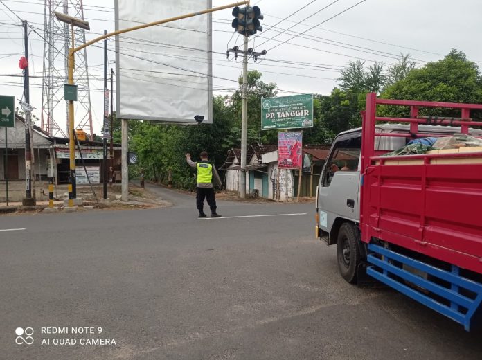 Seperti yang terlihat personil Polsek Singgahan Polres Tuban melakukan pengaturan lalu lintas dipagi hari dengan membantu menyeberangkan warga di simpang empat anjlok turut Desa Mulyoagung Kecamatan Singgahan Kabupaten Tuban. selasa pagi (4/5/21)