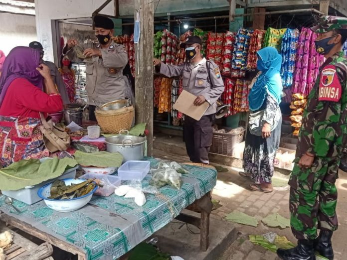 Nampak terlihat petugas giat Yustisi Protokol Kesehatan berada dilokasi pasar tradisional Desa Sidomukti, sekaligus memberikan Himbauan untuk disiplin menerapkan Protokol Kesehatan utamanya memakai masker.