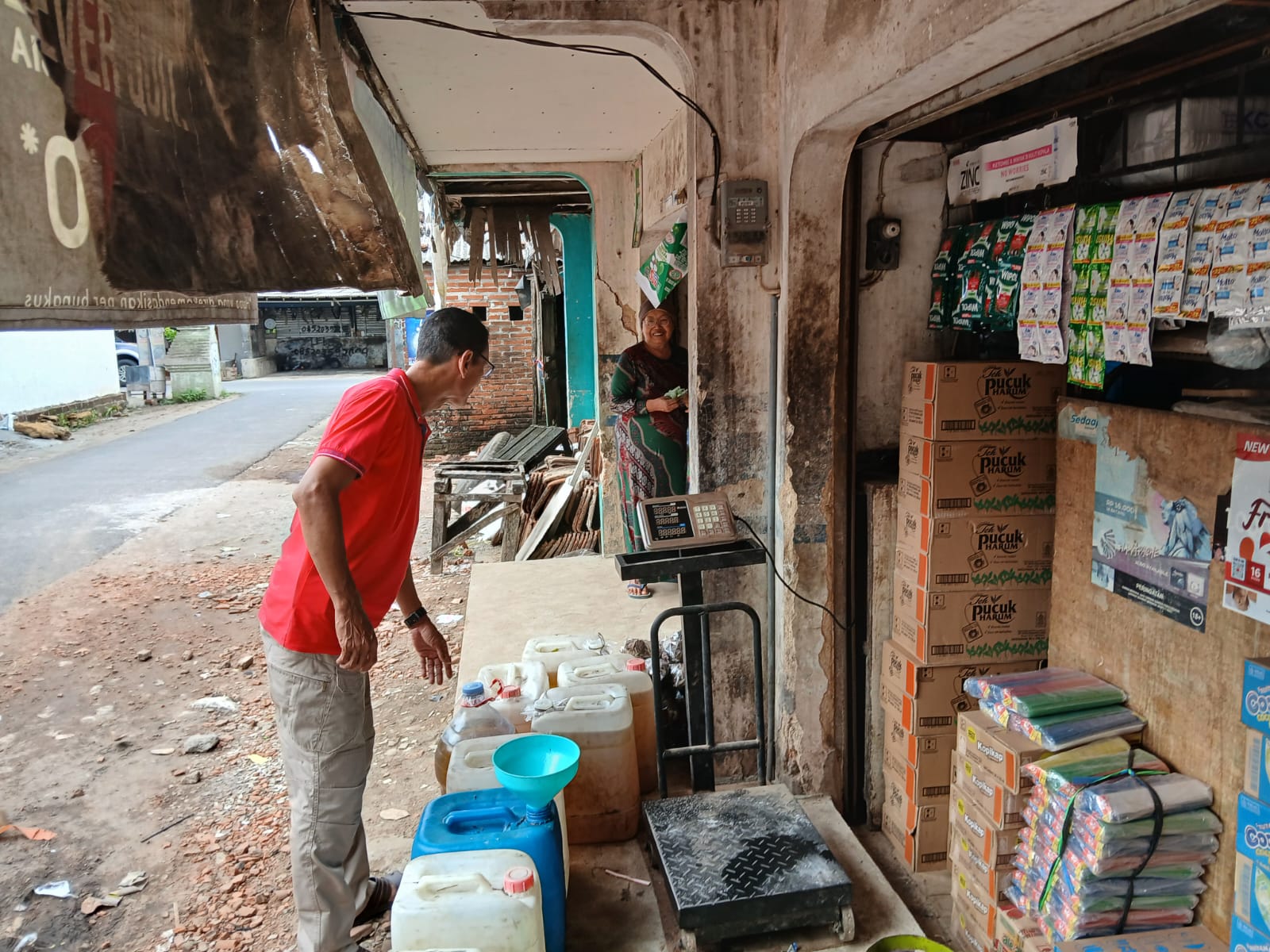 yang berjualan di pasar sambil mengecek harga bahan pangan yang sedang