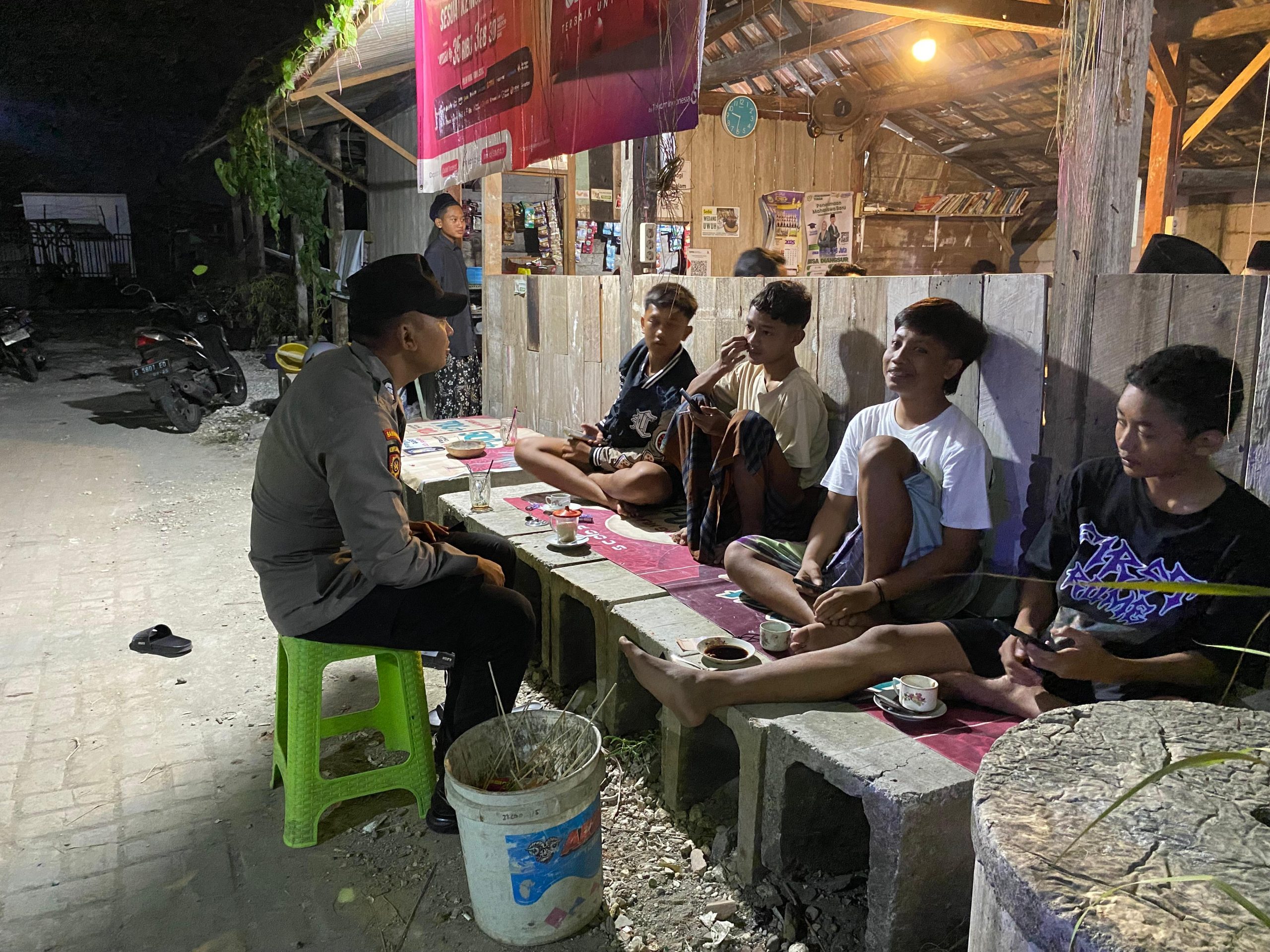 Senori – Dua Personil Polsek Senori Polres Tuban Brigadir Miftahul Aulidia Wicaksana Murdiantoro dan Bripda M. Khoirul Anam terlihat memberikan himbauan kamtibmas kepada komunitas pemuda yang sedang nongkrong di warung kopi Desa Sendang Kecamatan Senori, Rabu (30/7/2025 ) malam.