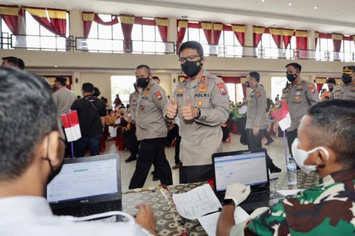 MOJOKERTO, Kapolda Jawa Timur Irjen Pol Nico Afinta, didampingi pejabat utama Polda Jatim, bersama jajaran Forkopimda Kabupaten Mojokerto diantaranya Bupati Mojokerto, Dandim 0815 dan Kapolres Mojokerto mengecek pelaksanaan vaksinasi massal serentak di Gedung PPNI Stikes Bina Sehat Kabupaten Mojokerto yang juga terkoneksi dengan kegiatan yang sama di Mandalika NTB yang dihadiri oleh Kapolri Jenderal Polisi Listyo Sigit Prabowo.