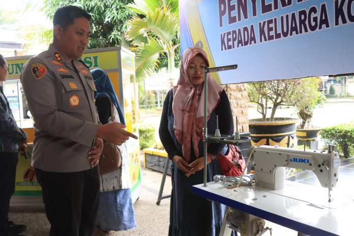 Kapolres Malang, AKBP Danang Setiyo, menyalurkan bantuan sarana pengembangan Usaha Mikro, Kecil, dan Menengah (UMKM) kepada tiga keluarga terdampak dalam sebuah acara yang berlangsung di Mapolres Malang, Sabtu (1/2/2025).