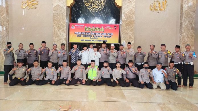 Widang – Menyambut HUT Korps Brimob Polri Ke 77, eks Brimob Polres Tuban menggelar kegiatan Pengajian dan Santunan Anak Yatim-piatu, Rabu (08/11/22).