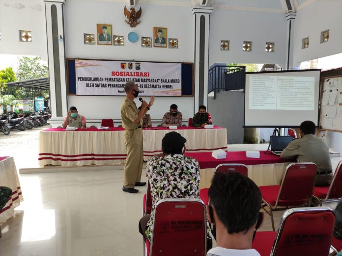 Forkopimka Kecamatan Rengel Kabupaten Tuban menggelar sosialisasi dan evaluasi ke desa seiring berjalannya kegiatan pemberlakuaan pembatasan kegiatan masyarakat berdkala mikro yang berbasis pada tingkat RT.