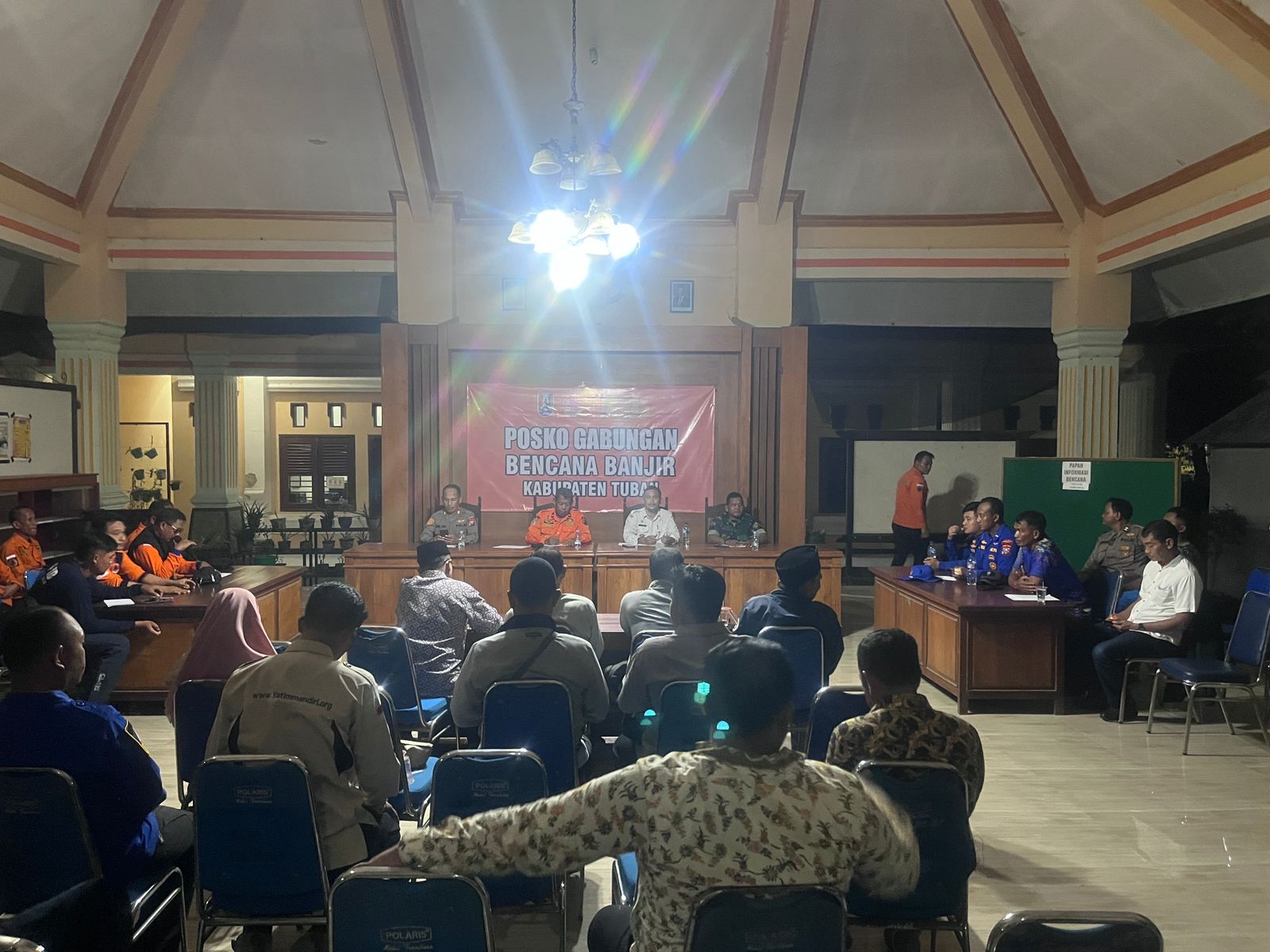 Forkopimka Kecamatan Rengel Kabupaten Tuban bersama BPBD Kabupaten Tuban serta Kepala Desa melaksanakan Rapat Koordinasi Penanganan Bencana Banjir Luapan Sungai Bengawan Solo yang terjadi di beberapa desa di Wilayah Kecamatan Rengel Kabupaten Tuban. Rabu malam, (21/5/2025).