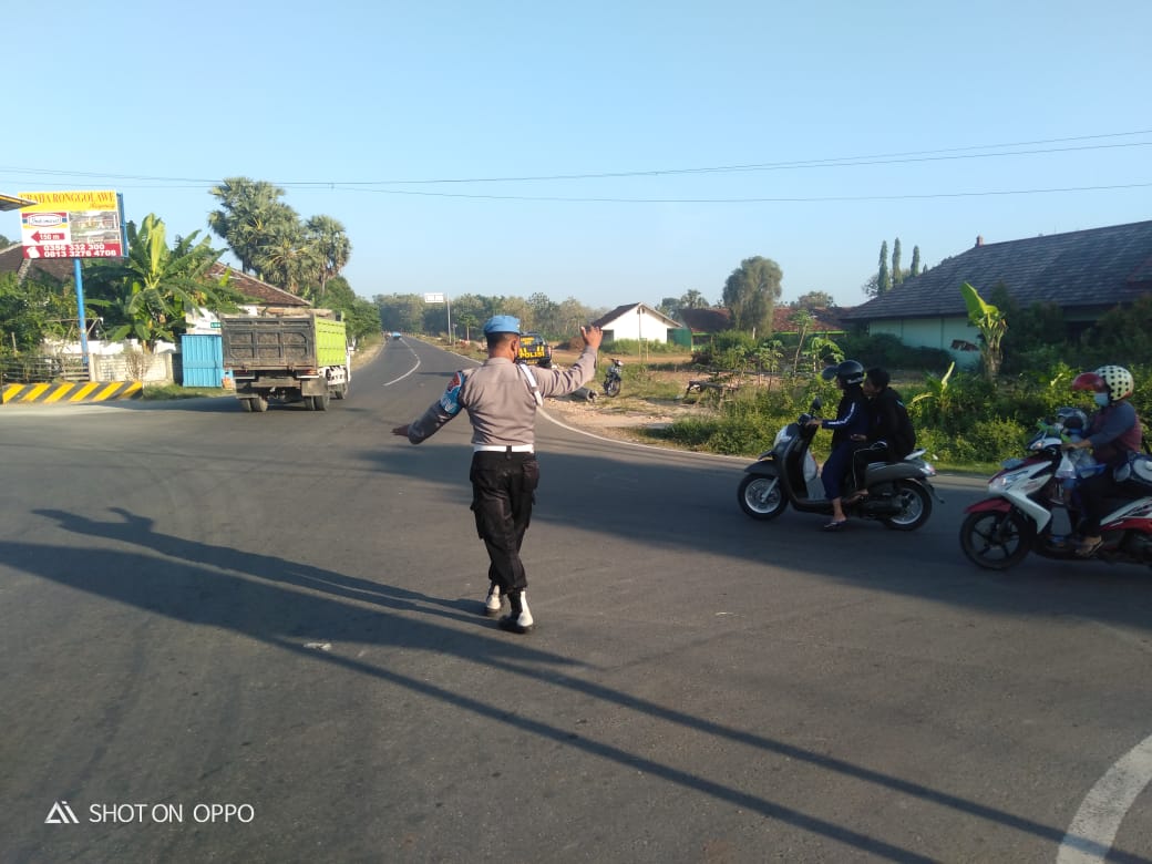Terlihat di SP4 ringroad Samanding, anggota melaksanakan pengaturan lalu lintas menyeberangkan masyarakat yang sedang beraktifitas di pagi hari.