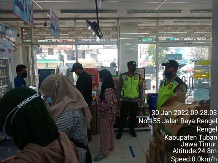 Kali ini petugas Polsek Rengel melakukan kegiatan di pertokoan dan tempat perbelanjaan di Kawasan Simpang Empat Desa Rengel Kecamatan Rengel Kabupaten Tuban. Minggu, (30/1/2022).