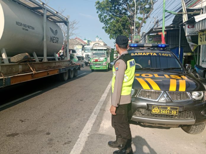 Regu patroli Polsek Jenu Polres Tuban Briptu Candra dan rekan melaksanakan patroli Pantura sekaligus pemantauan arus lalu lintas di beberapa titik rawan tindak pidana jalan di jalan raya di sekitar Pantura.