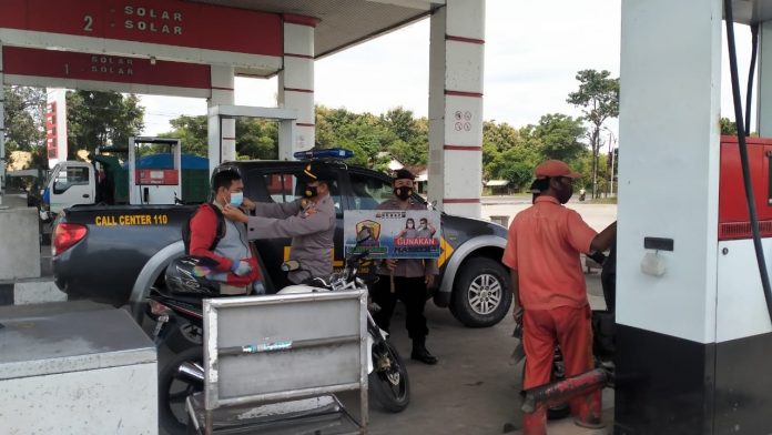 seopini.com-polrestubanpoldajatim Polsek Bancar Polres Tuban Pada kesempatan siang itu menggelar giat YUSTISI Pendisiplinan Protokol Kesehatan dengan sasaran masyarakat atau konsumen yang berada di SPBU perbatasan Ds Sukolilo kecamatan Bancar Tuban. 02 April 2021.