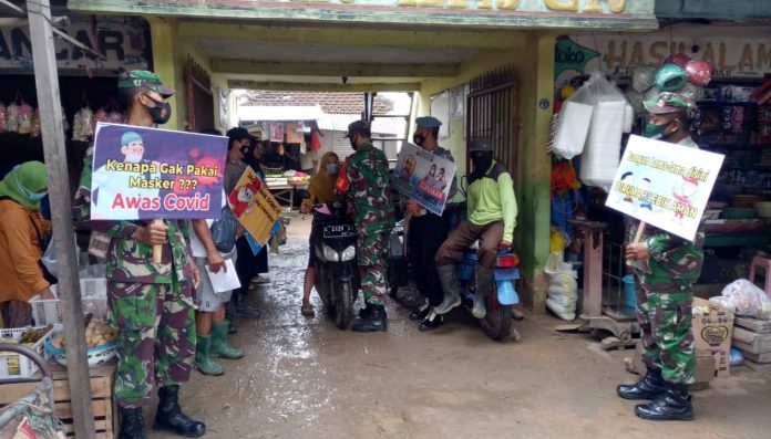 Pada kesempatan siang itu di lakukan oleh anggota Polsek Bancar bersama Koramil Bancar Melaksanakan giat YUSTISI Pendisiplinan Protokol Kesehatan dengan sasaran pengunjung Pasar Layur Ds Banjarjo kecamatan Bancar Tuban.