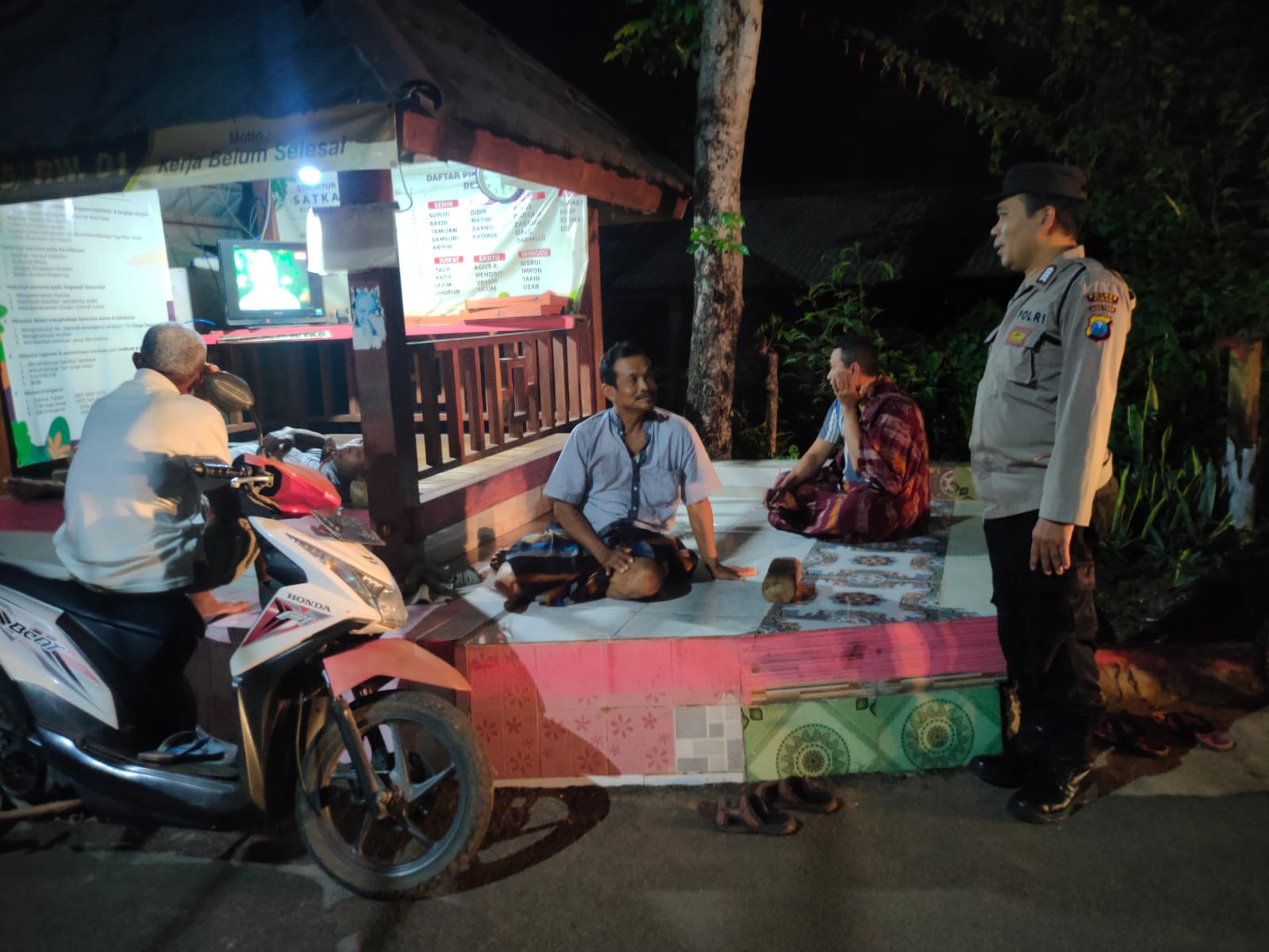 Seperti halnya yang dilakukan Bhabinkamtibmas Desa Plajan Bripda Rendy menyambangi  warga  yang sedang duduk-duduk santai dan ngobrol di pos ronda , pada kesempatan yang baik tersebut Bhabinkamtibmas menyampaikan pesan-pesan kamtibmas dan Mengajak masyarakat untuk meningkatkan kewaspadaan serta untuk bersama-sama ikut serta menjaga keamanan lingkungan guna mencegah terjadinya gangguan kamtibmas.