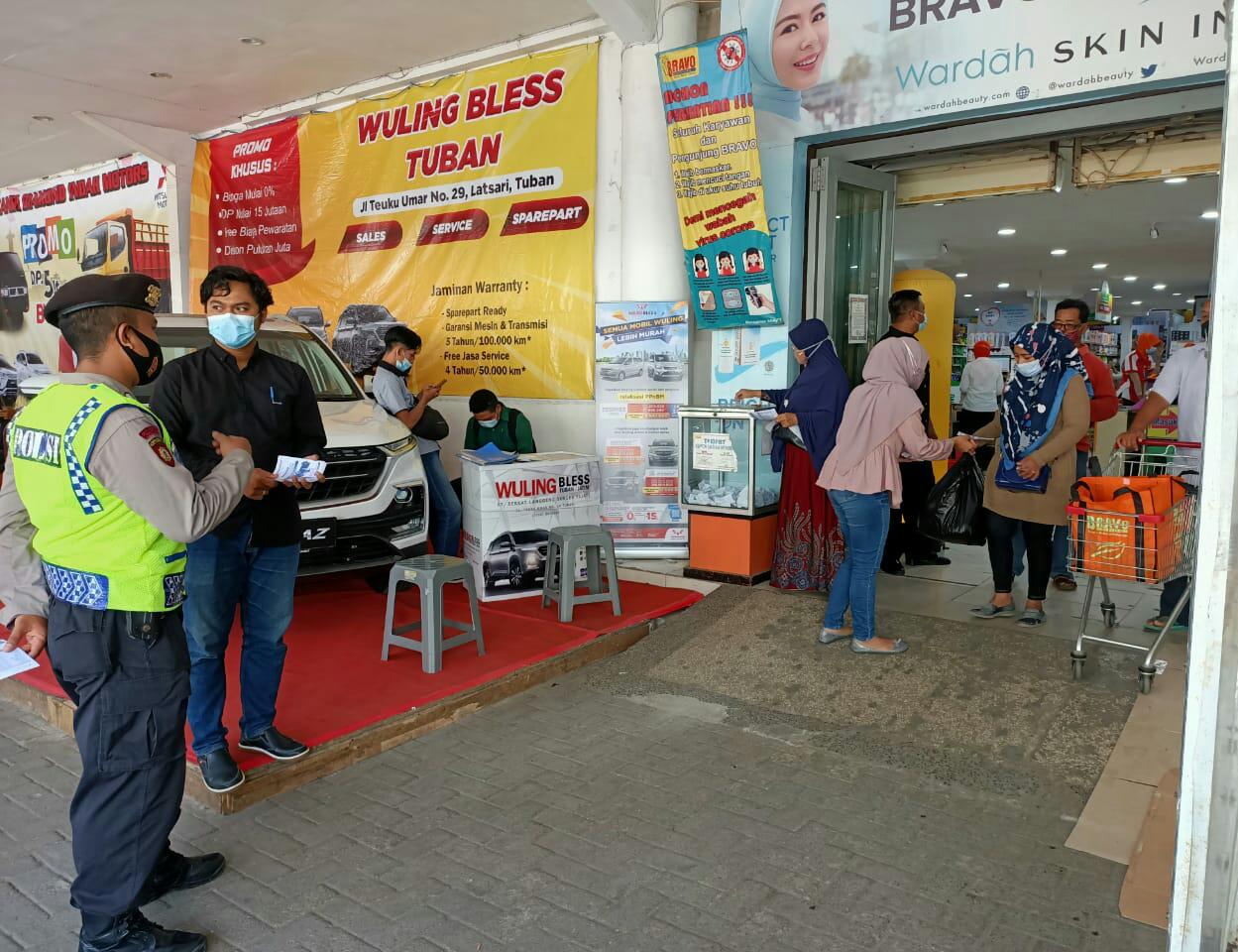 seopini.com-polrestubanpoldajatim Anggota Polsek Tuban melaksanakan Giat Yustisi dengan sasaran tempat tempat kerumunan masyrakat. Seperti yang telah dilakukan anggota unit sabhara Polsek Tuban pada hari ini kamis (18/03/2021) melaksanakan giat Yustisi protokol kesehatan menyasar salah satu pusat perbelanjaan modern yang ada dikecamatan Tuban yang beralamatkan di jl. Basuki Rahmad kelurahan kutorejo kec. Tuban.