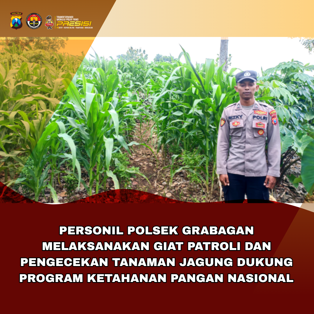 Polri dalam hal ini Polda Jatim khususnya Polres Grabagan mendukung program ketahanan pangan guna mewujudkan swasembada pangan Indonesia. Salah satu upaya nyata diwujudkan melalui kehadiran bhabinkamtibmas Desa Grabagan Polsek Grabagan Polres Tuban Polda Jatim melaksanakan kunjungan ke perkarangan milik warga Desa Grabagan kecamatan Grabagan Kabupaten Tuban.