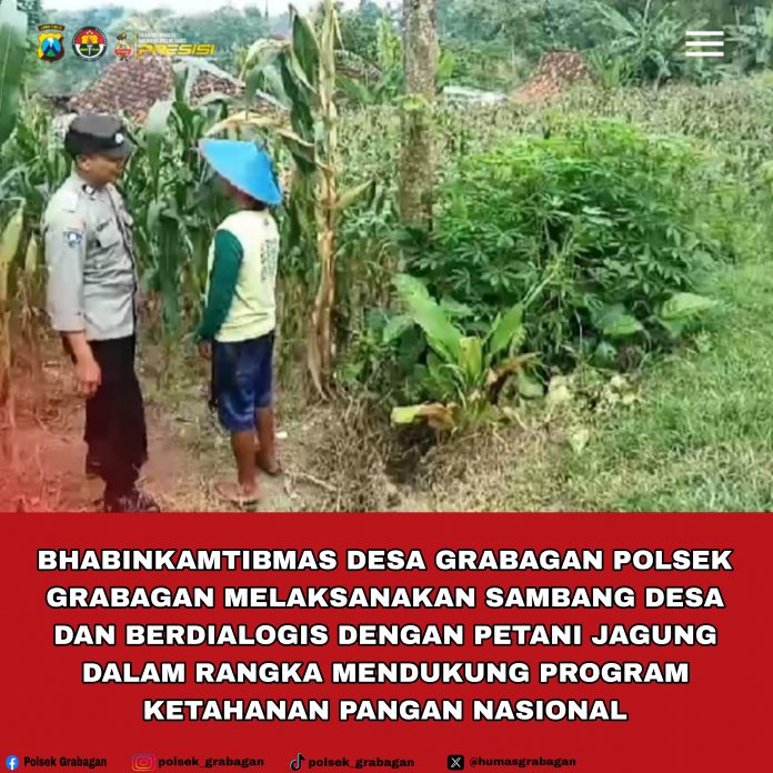Polri dalam hal ini Polda Jatim khususnya Polres Grabagan mendukung program ketahanan pangan guna mewujudkan swasembada pangan Indonesia. Salah satu upaya nyata diwujudkan melalui kehadiran bhabinkamtibmas Desa Grabagan Polsek Grabagan Polres Tuban Polda Jatim melaksanakan kunjungan ke perkarangan milik warga Desa Grabagan kecamatan Grabagan Kabupaten Tuban. Kunjungan tersebut dilakukan Bhabinkamtibmas guna mendukung program ketahanan pangan nasional yang dicanangkan pemerintah.