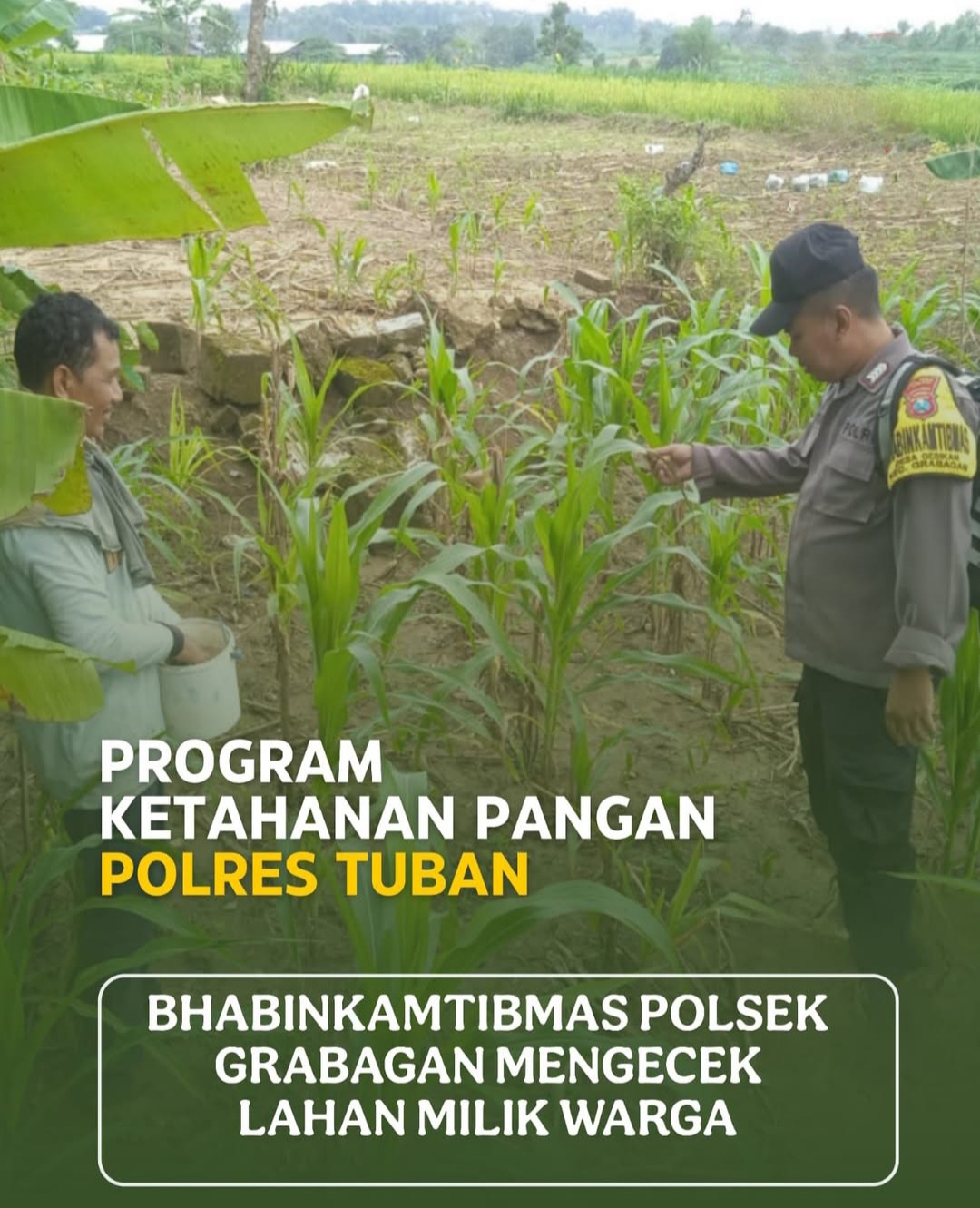 Polri dalam hal ini Polda Jatim khususnya Polres Grabagan mendukung program ketahanan pangan guna mewujudkan swasembada pangan Indonesia. Salah satu upaya nyata diwujudkan melalui kehadiran bhabinkamtibmas Desa Menyunyur Polsek Grabagan Polres Tuban Polda Jatim melaksanakan kunjungan ke perkarangan milik warga Desa Menyunyur kecamatan Grabagan Kabupaten Tuban. Kunjungan tersebut dilakukan Bhabinkamtibmas guna mendukung program ketahanan pangan nasional yang dicanangkan pemerintah.